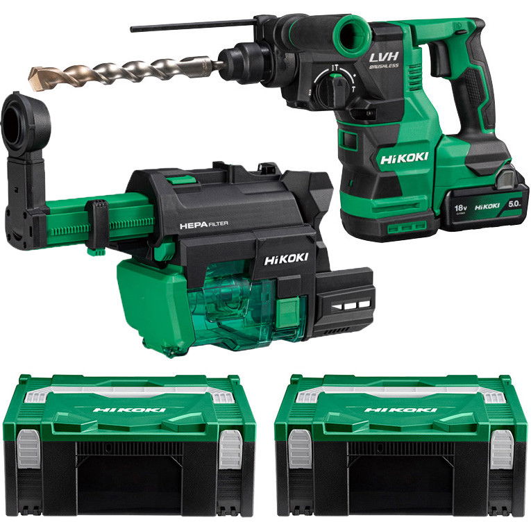 HiKoki DH1826DA-WUZ akkus SDS-plus fúró-vésőkalapács porelszívóval (2 x 5.0 Ah Li-ion akkuval, 2 db Hitbox kofferrel)